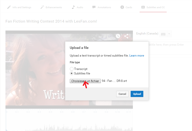 6.2. It shows a frame “Upload a file”. Choose the file type “Subtitle file” by clicking into the circle ahead that line (“transcript” was the default position). Rem : the “Upload” button below on the right is not highlighted and is pale blue. |